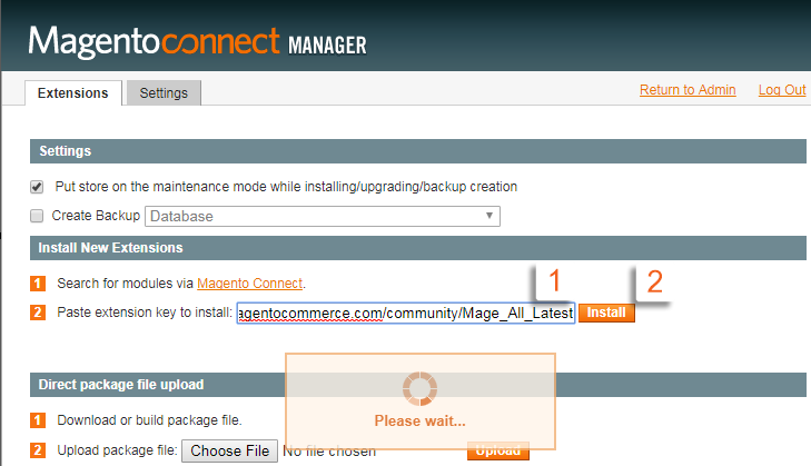 Note: If this is the first time you log in to Magento Connect (i.e. no packages are listed under the 'connect.magentocommerce.com/core' channel), you will need to prepare the downloader by typing "connect20.magentocommerce.com/community/Mage_All_Latest" in the Extension Key field, and then click on the Install button: