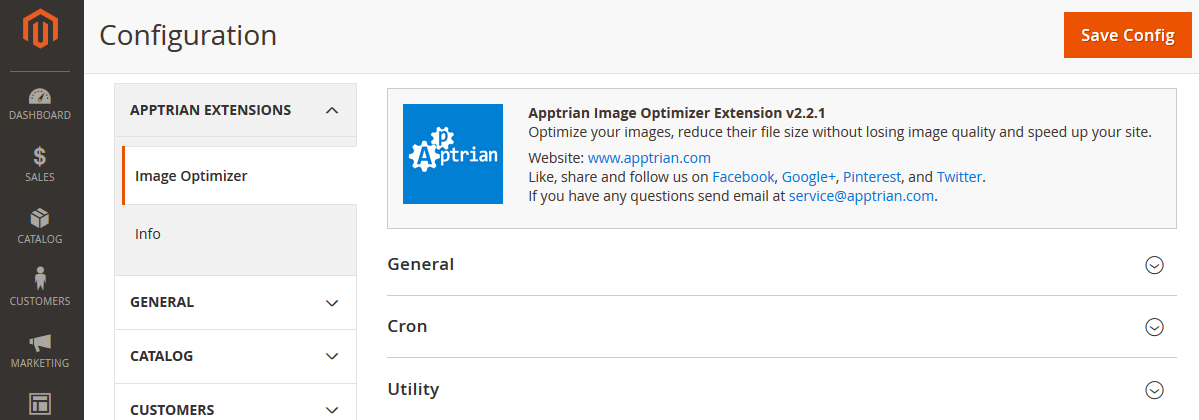 Once enabled, go to: Stores >> Configuration where you should find the Apptrian Extensions page: