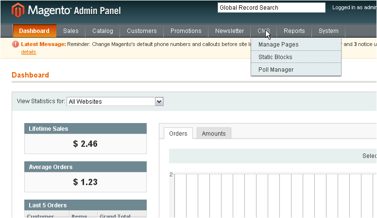 This tutorial will show you how to use the CMS (Content Management System) in Magento Commerce, and assumes you're already logged in to Magento