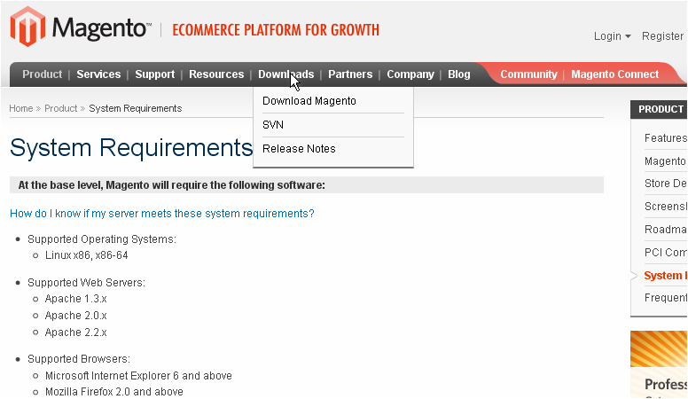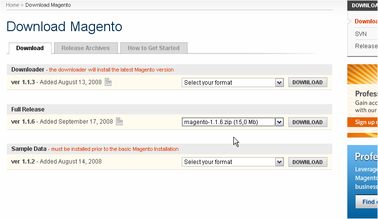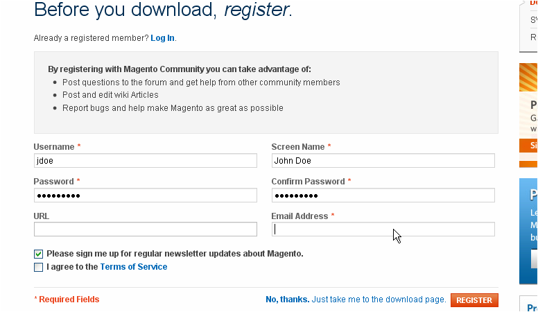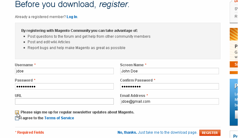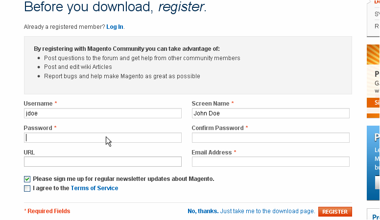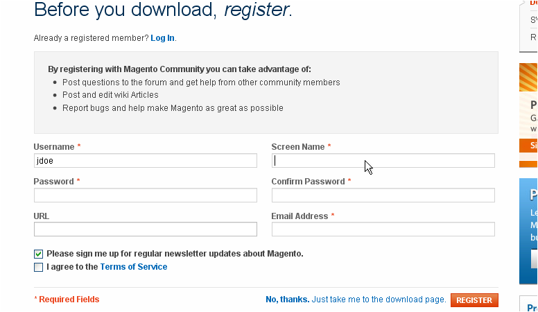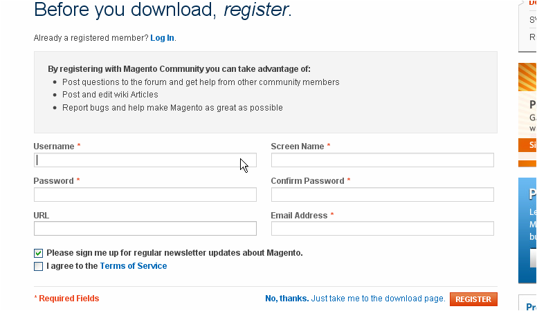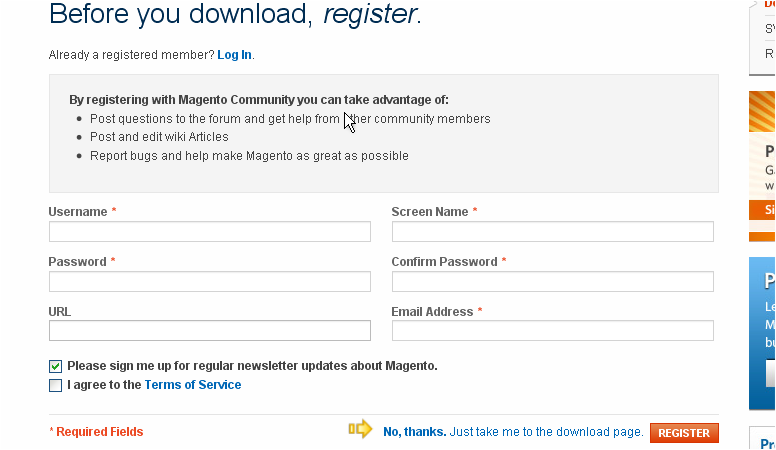 Before you can download Magento, you will be asked to register. This is not required but recommended if you want to post questions in the forum, post and edit wiki articles, or report bugs. If you want to skip registration, click this link