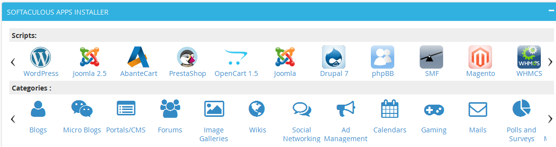 Softaculous is an "auto installer" application which allows the installation of more than 370 great scripts such as WordPress, Joomla, Magento, Drupal and etc. and 1115 PHP Classes by the click of a button.