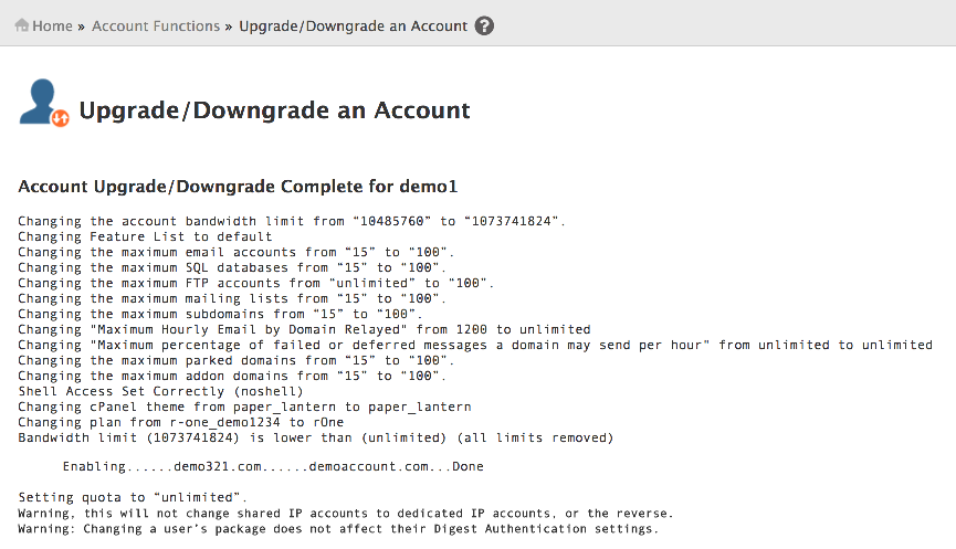 The account's package has been changed successfully. You'll see a list of all the changes WHM has made below.