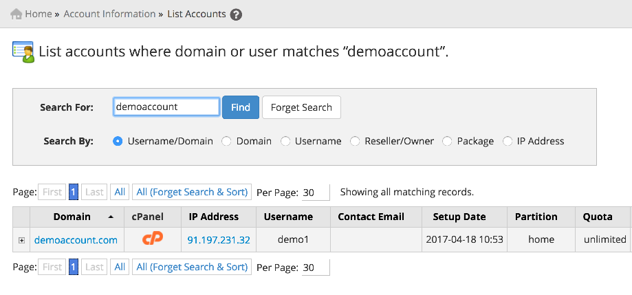 3) Select an account from the list using its main domain or username, or search for an account below.